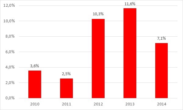 No Gráfico 6, é possível observar que, até 2008, a capacidade de investir com recursos próprios subiu consideravelmente, em 0,9 p.p. do PIB desde 2003. Porém, no período pós da crise de 2009, esse indicador caiu fortemente para 1,2% do PIB. Houve recuperação em 2010 e 2011 e voltou a mostrar deterioração em 2012 e 2013. Em 2013, a capacidade de investir com recursos próprios dos estados atingiu o menor nível em 10 anos, 1% do PIB, ou seja, apenas 7,5% de tudo o que é arrecadado pelos estados.