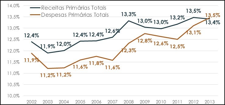 a despeito da dificuldade de elevar, de forma significativa, os tão necessários investimentos públicos. Separando as despesas nos dois períodos de análise (2003-2008 e 2009-2013), observa-se que as despesas de pessoal, de custeio e de investimentos cresceram cada 0,4 p.p. do PIB entre 2003 e 2008 cada uma. No total, as despesas totais cresceram 1,2 p.p. do PIB (inferior ao crescimento das receitas).